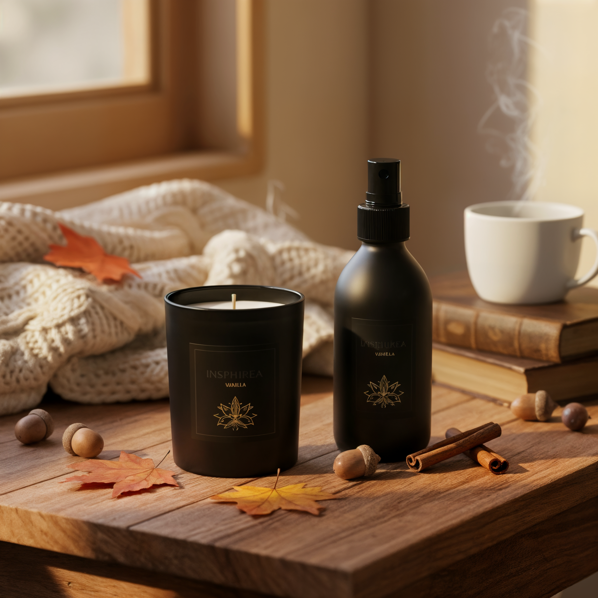 Roomspray: water, plantaardige alcohol, parfumoliën (vanille, musk)